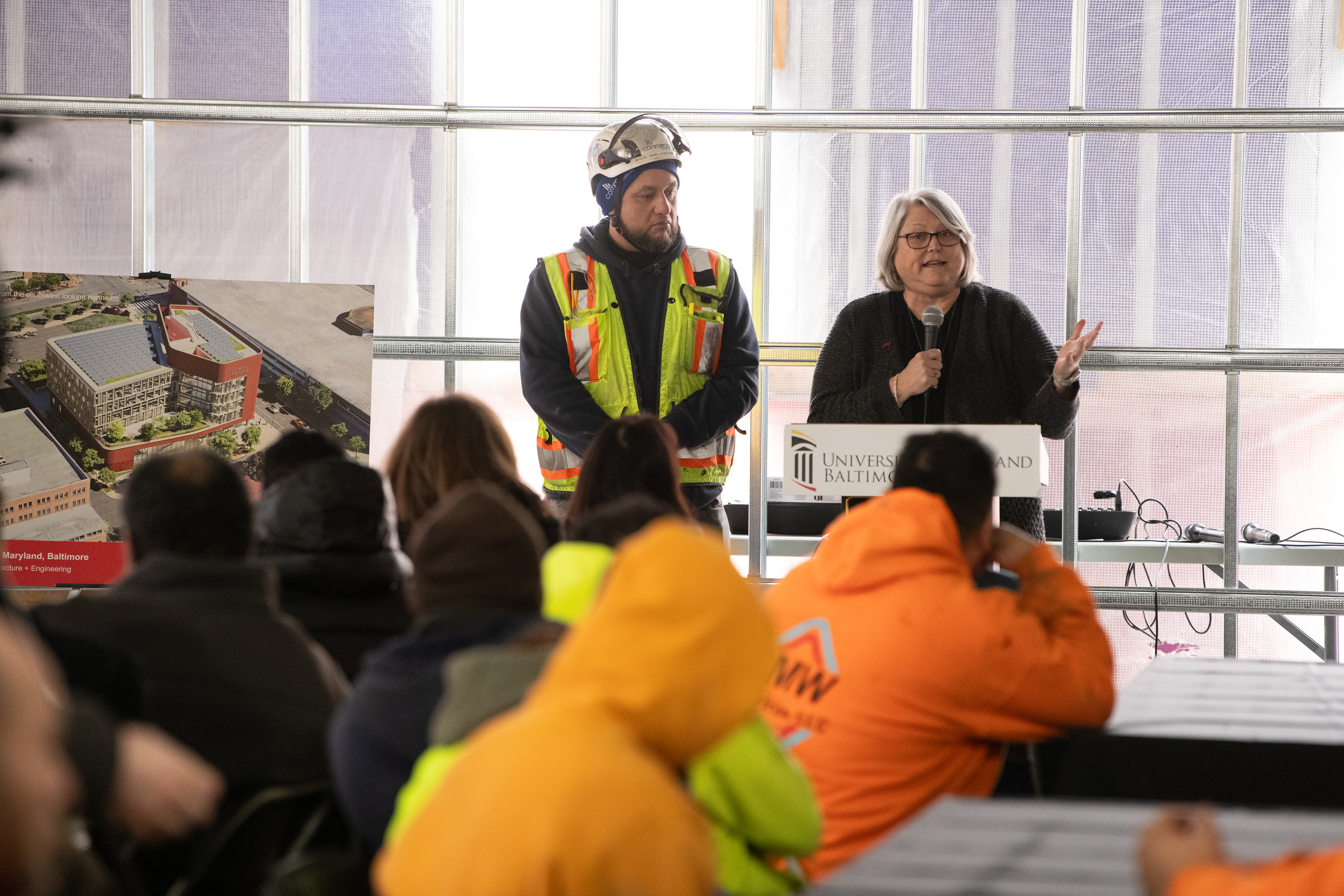 University of Maryland, Baltimore (UMB) faculty, staff, and students joined the Whiting-Turner Contracting Company crew and Ballinger architects Wednesday, Feb. 25 inside the school’s future assembly room to reflect on what this construction milestone represents: change.